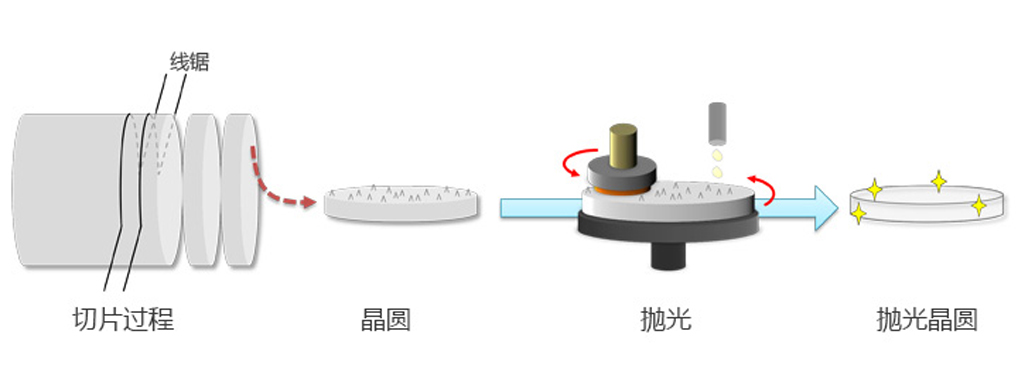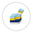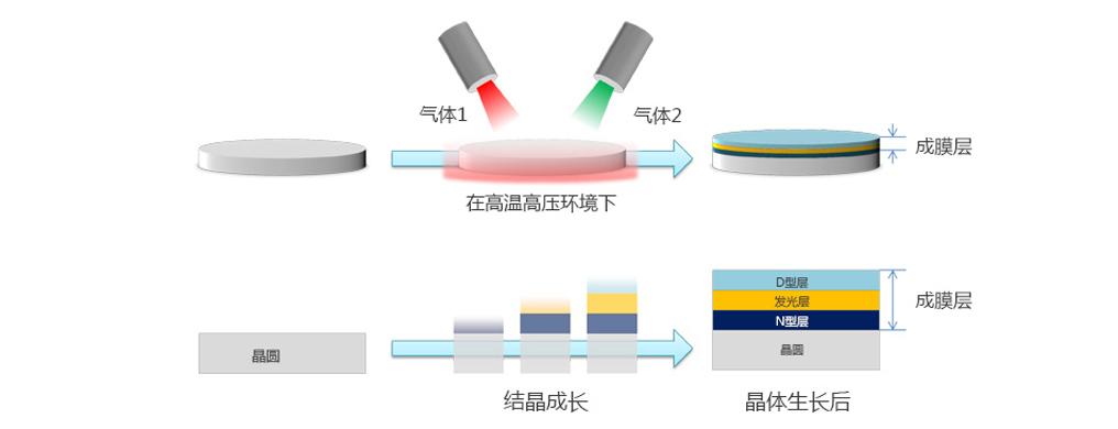 接下來是“晶體生長”。在這里,我們?cè)诰A上制作用于發(fā)光作為LED的薄膜。頂部是過程的俯視圖,底部是橫截面。在晶片周圍的高溫高壓環(huán)境下吹入氣體,并通過化學(xué)反應(yīng)在晶片表面上沉積形成薄膜。這樣重復(fù)多次以制作多層薄膜結(jié)構(gòu)。